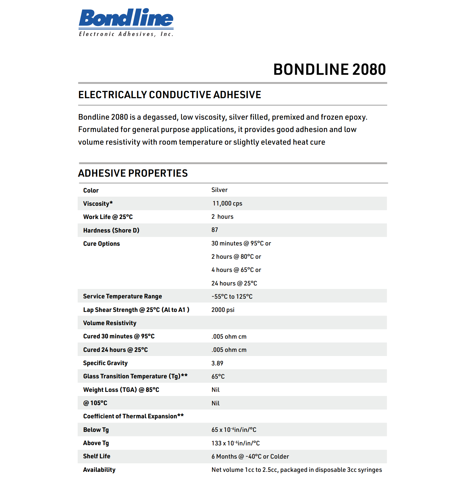 Bondline 2080 is a degassed, low viscosity, silver filled, premixed and frozen epoxy. Formulated for general purpose applications, it provides good adhesion and low volume resistivity with room temperature or slightly elevated heat cure