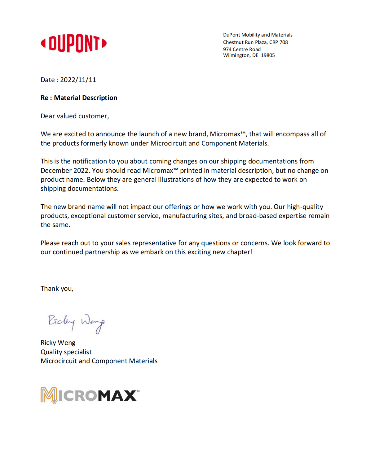 杜邦宣布2023年1月1號起正式推出一個新品牌 Micromax,該品牌將涵蓋以前屬于微電路及元件材料的產品。Micromax 產品用于各種電子應用——從汽車、無源元件和 5G 通信到醫療保健和消費品。"Micromax 旨在成為電子厚膜油墨、漿料和生瓷帶的領先品牌,新品牌名稱不會影響產品與客戶合作的方式。我們的高品質產品、卓越的客戶服務和廣泛的專業知識保持不變。識別我們的產品只會更快、更容易。