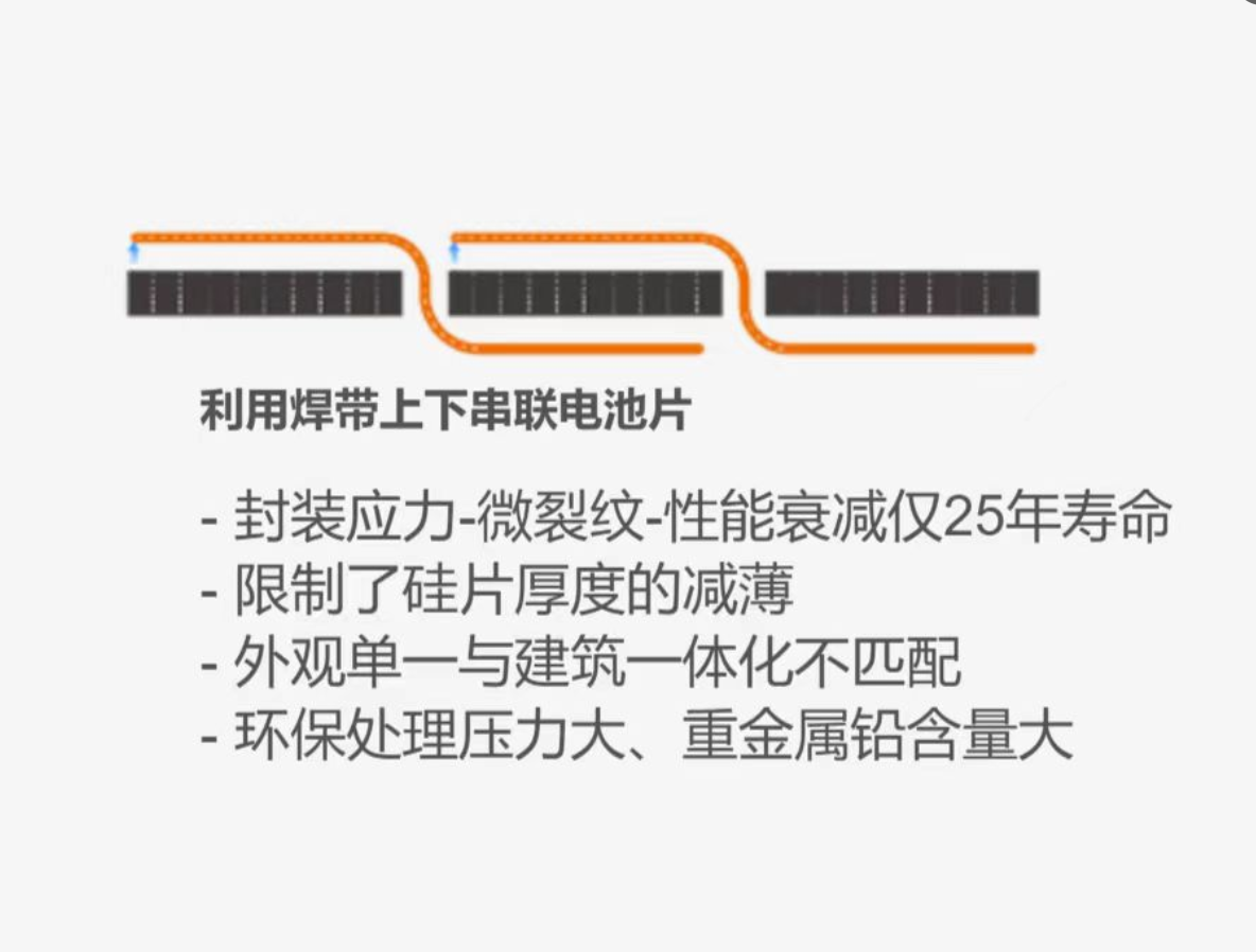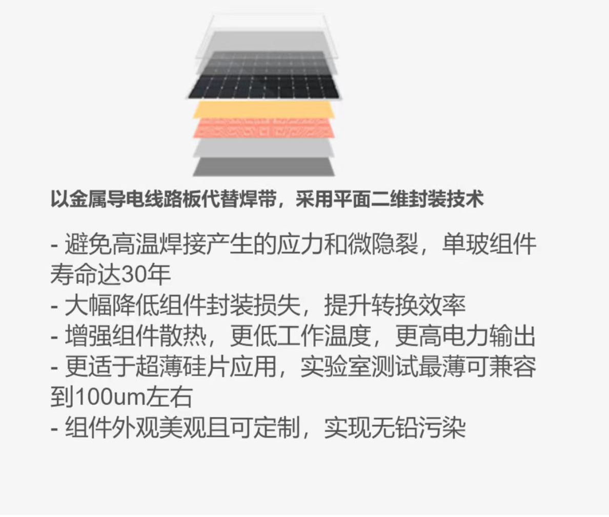 在組件環節,電池片與電池片之間的連接均在電池片的背面實現,消除了常規組件中相鄰電池片之間通過焊帶從正面到背面的連接所導致的應力,從而避免了可能產生的電池片隱裂等可靠性問題。